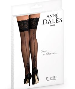 Bas autofixants Denise en résille noire avec une couture fantaisie, par Anne d’Alès.