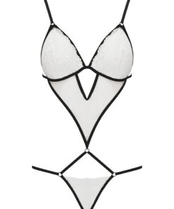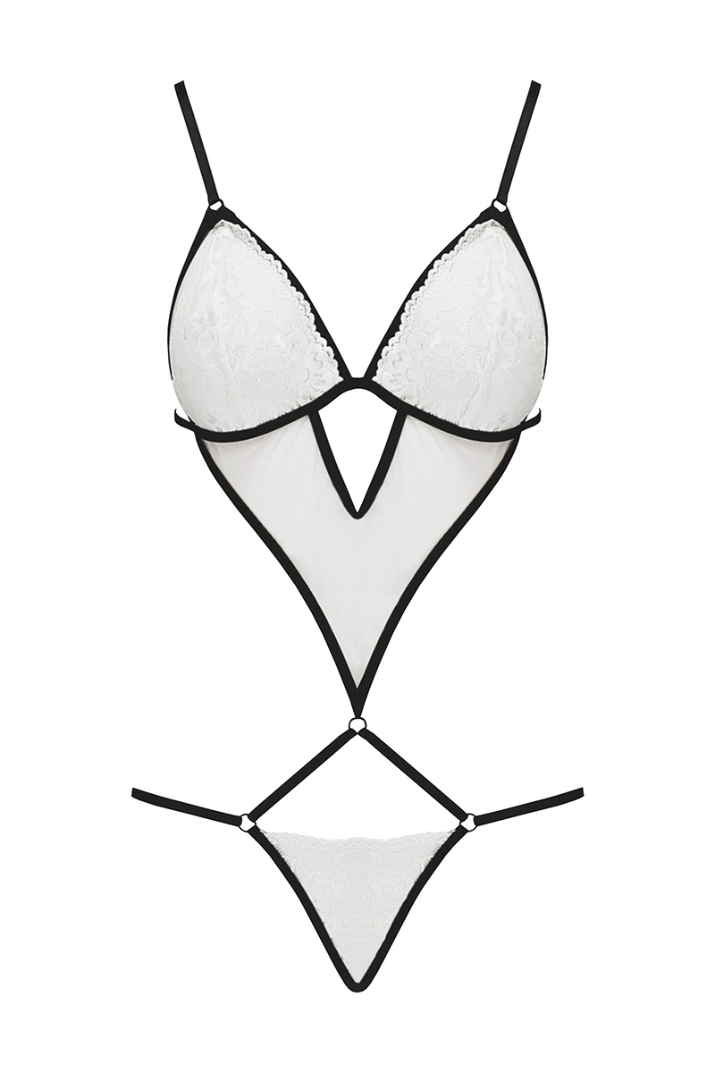De par sa coupe originale et son jeu de dentelle blanche semi-transparente sensuelle, ce body sublimera tous les corps.