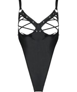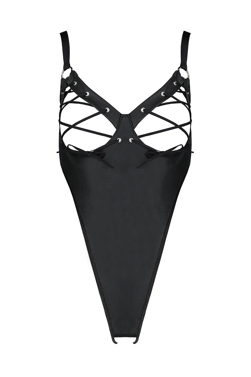 Pimentez vos moments coquins avec ce body érotique sexy BDSM en faux cuir noir mat, ouvert sur les seins et l’intimité.