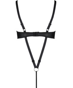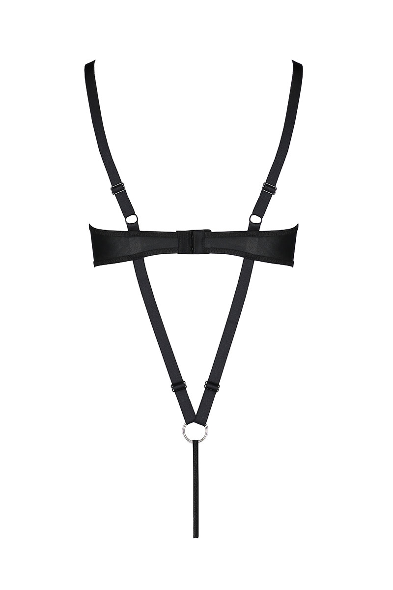 Derrière, les bretelles forment un V plongeant jusqu’à la raie des fesses couronnée d’un anneau en harmonie. Une attache à agrafes permet d’ajuster le soutien-gorge.