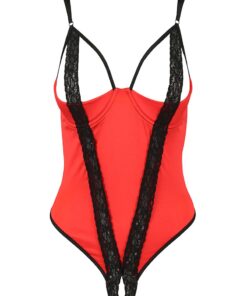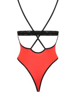 Lingerie fantaisie en rouge et noir, ce modèle soigné est souligné d’un passepoil noir qui dessine les contours du body.