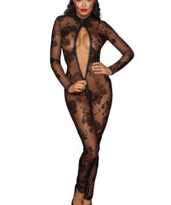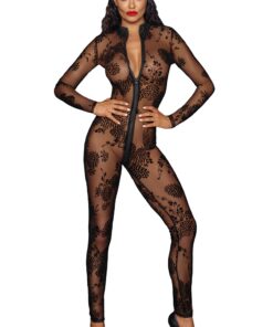 Exhibez vos charmes dans cette combinaison intégrale en tulle floqué totalement transparente, dont le triple zip permet toutes les audaces.