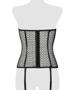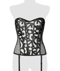 Le design soigné et très féminin de ce corset est un écrin qui met en valeur la silhouette. Les seins bombés, la taille affinée, la transparence du tulle qui laisse deviner l’anatomie sous les riches arabesques florales, le dos habillé d’un tissus ajouré au bel effet, ce corset est une lingerie qui excite les sens.