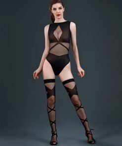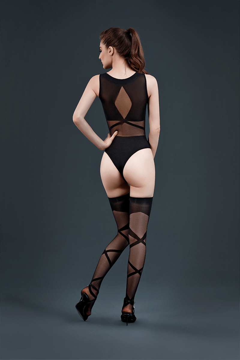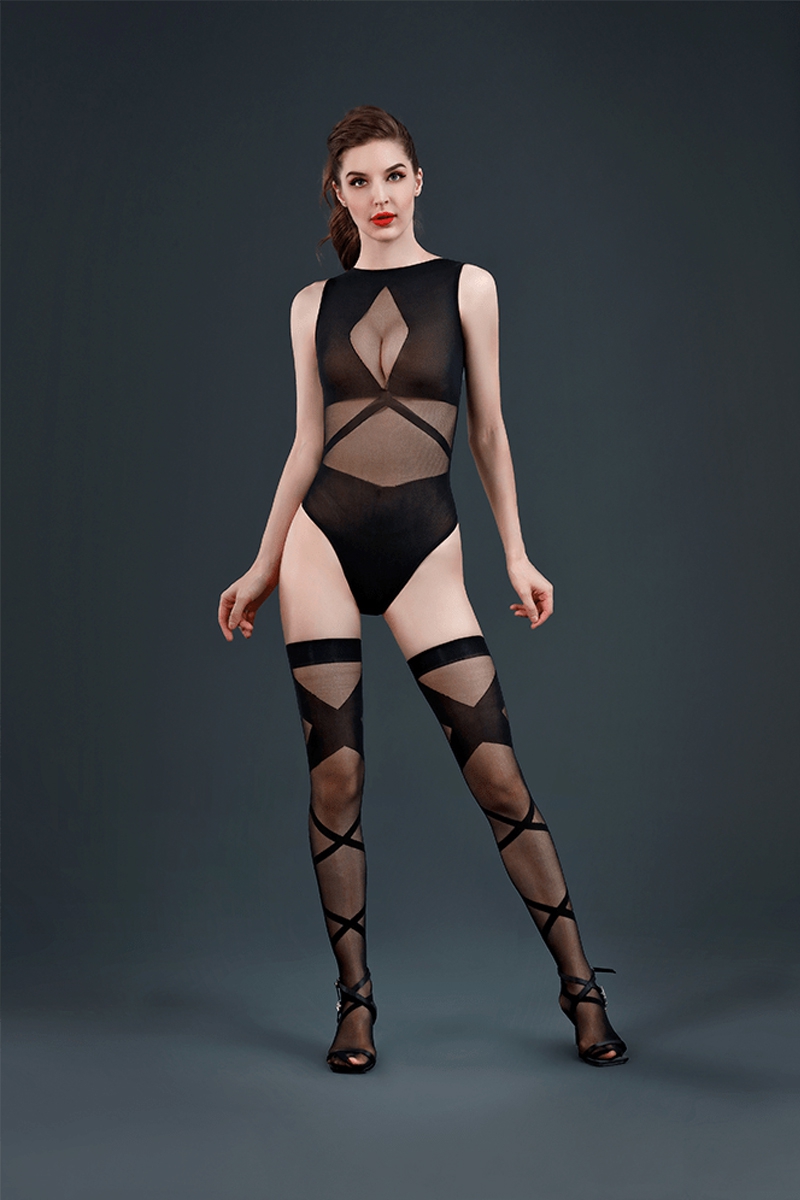 La marque de lingerie Moonlight présente son modèle n° 17, un ensemble coquin en résille composé d’un body et de bas assortis mariant de manière sensuelle et classe des zones transparentes et des zones opaques.