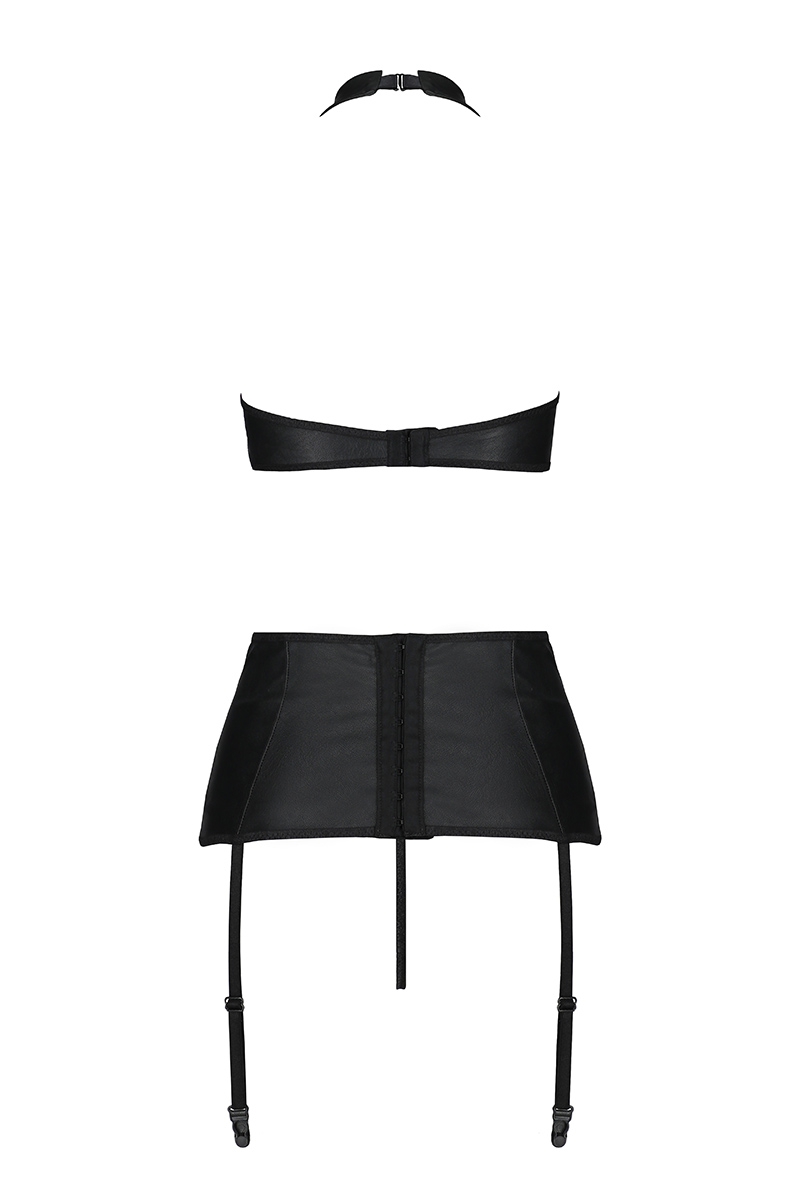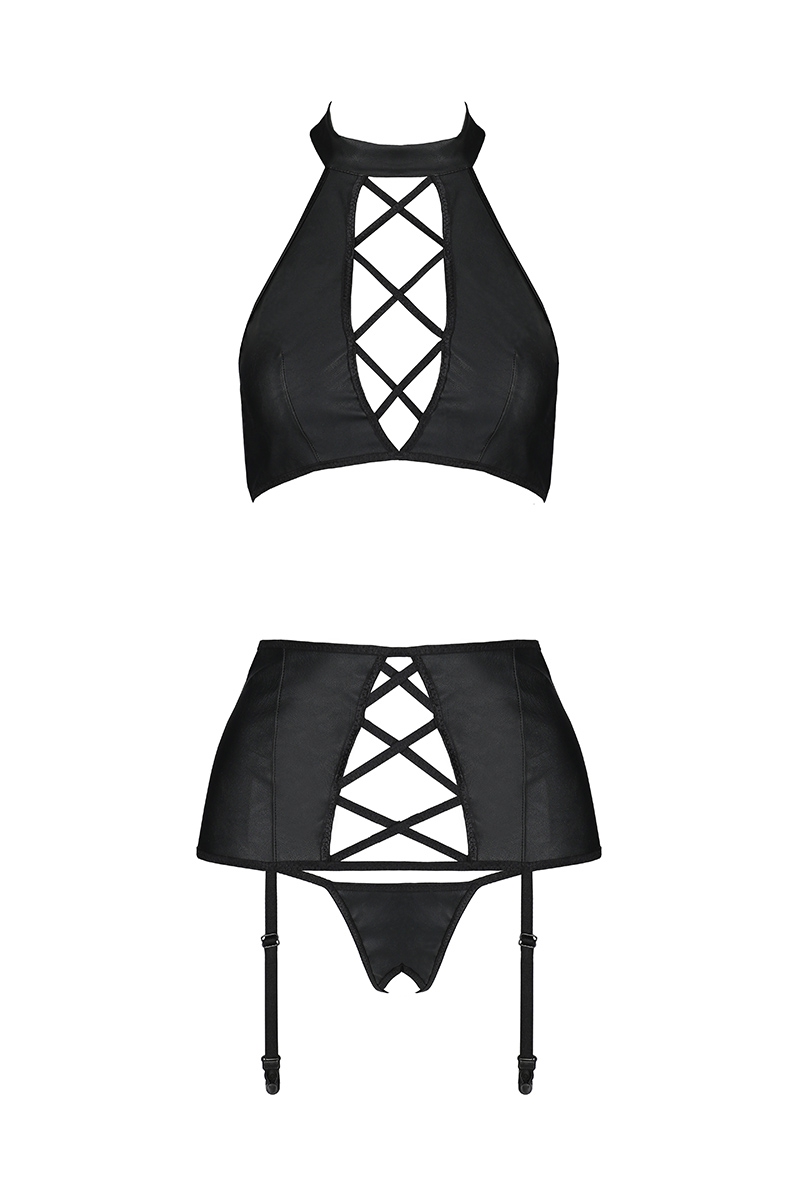 Ensemble trois pièces de lingerie sexy en faux cuir noir Nancy, une tenue érotique féminine et provocante par la marque de lingerie Passion.