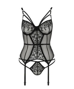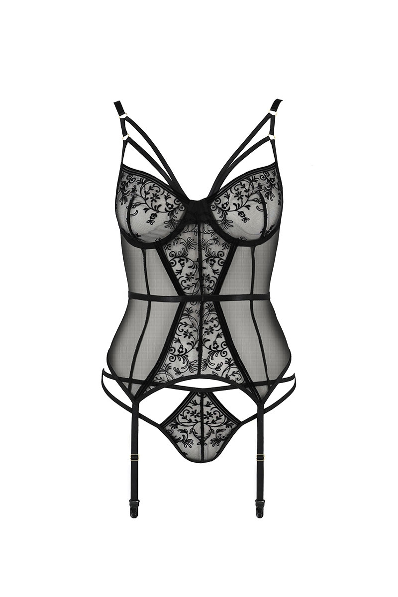 Ensemble fait de tulle noir transparent, de belle dentelle au motif fleuri et de bretelles mises en valeur, cet ensemble de charme guêpière et string est la lingerie que vous aimerez porter sous votre robe préférée.