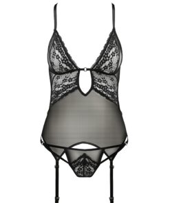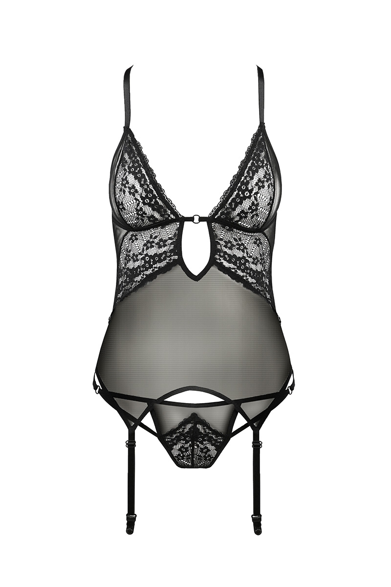 Très doux et confortable, le corps de la guêpière est un tube de tulle noir extensible qui montre en transparence. Soulignée par une bande noire fermée sur un anneau au creux des seins, la poitrine profite des bonnets triangle en dentelle pour attirer le regard sur ses sensuelles rondeurs.