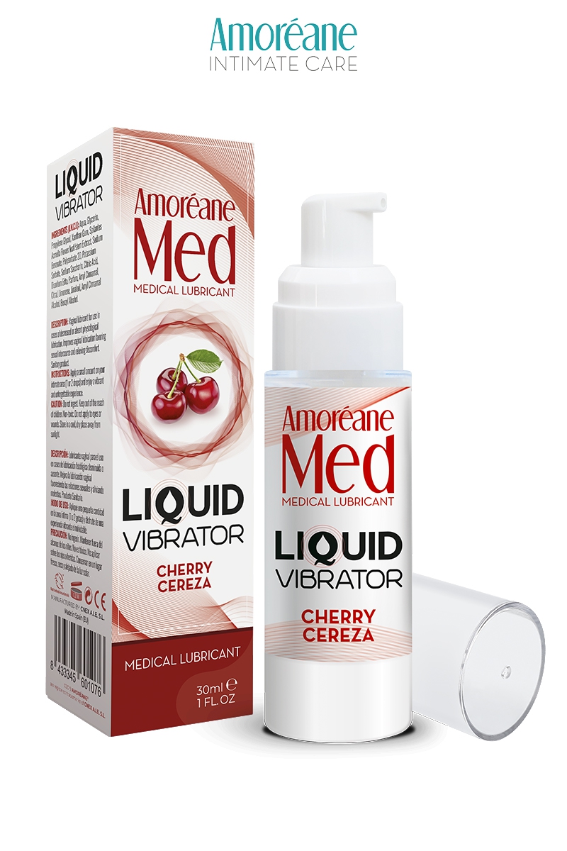 Liquid Vibrator cerise, fabriqué par Amoréane Med est un lubrifiant intime médical à base d’eau parfumé à la cerise avec effet vibrant.