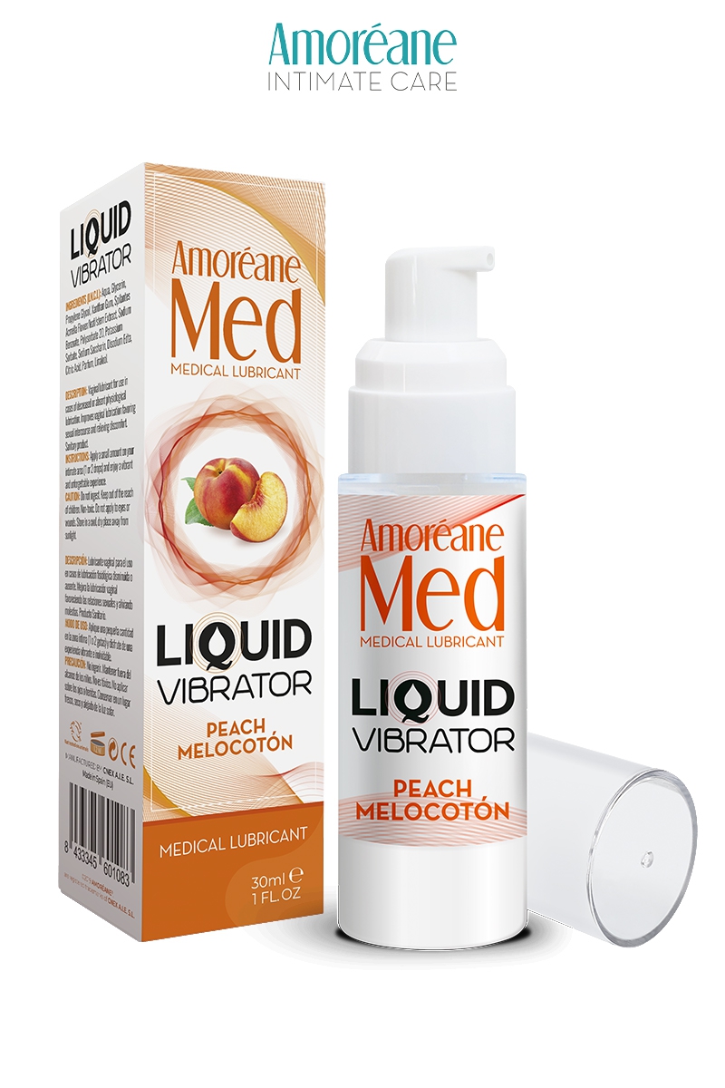 Liquid Vibrator pêche, fabriqué par Amoréane Med est un lubrifiant intime médical à base d’eau parfumé à la pêche avec effet vibrant.