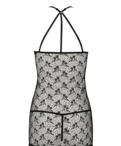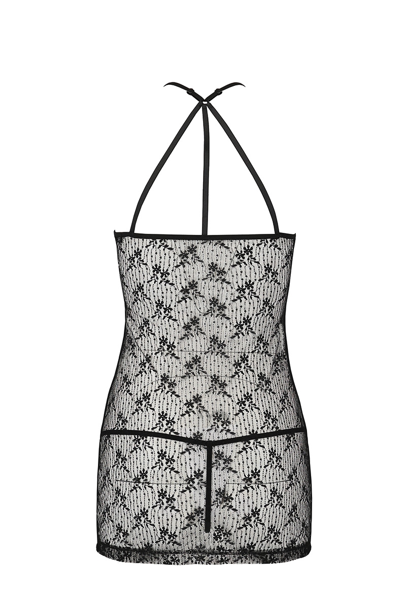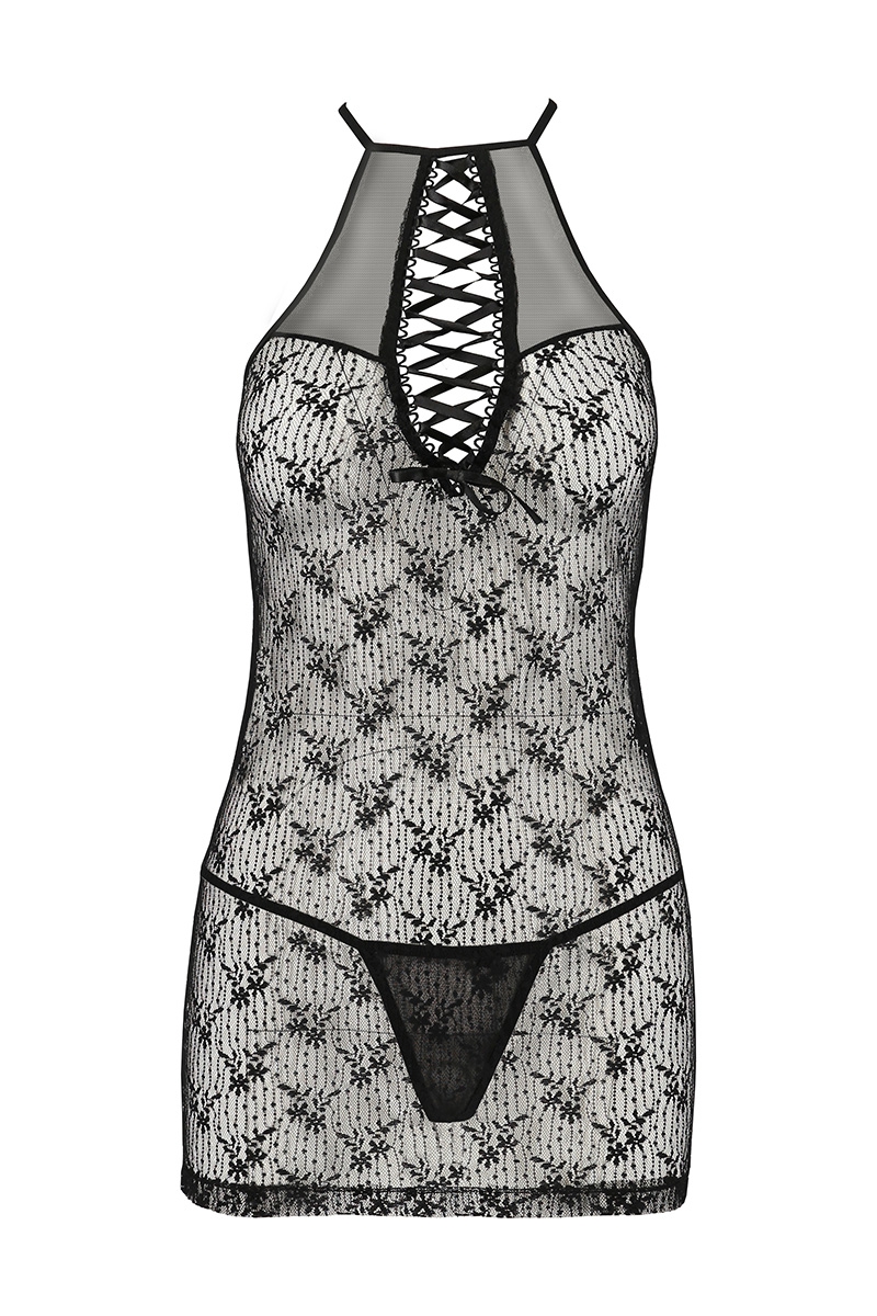 Le haut de la nuisette, très sensuel, présente un décolleté ras du cou en fine résille avec une décoration de laçage en satin en son centre. Un petit nud apporte un détail raffiné à lensemble.