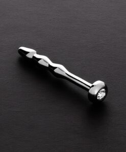 Très beau plug de pénis en acier inoxydable poli, orné à sa base d’un bijou en strass imitant un cristal.