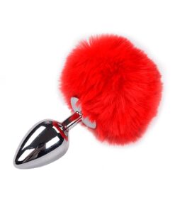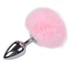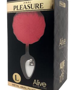 Plug anal en métal, modèle Large 9 x 4 cm, forme lisse, surmonté d’un pompon noir en fourrure synthétique.