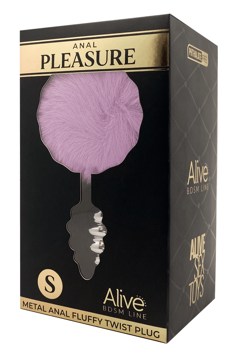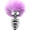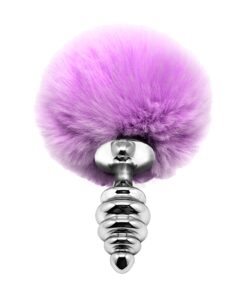Plug anal en métal, modèle Small 7 x 2,8 cm, forme annelée, surmonté d’un pompon mauve en fourrure synthétique.