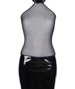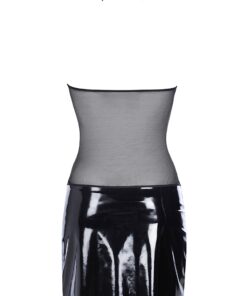 La partie basse de cette robe est fabriquée en vinyle noir brillant, la partie haute est elle, fabriquée en tulle noir transparent.