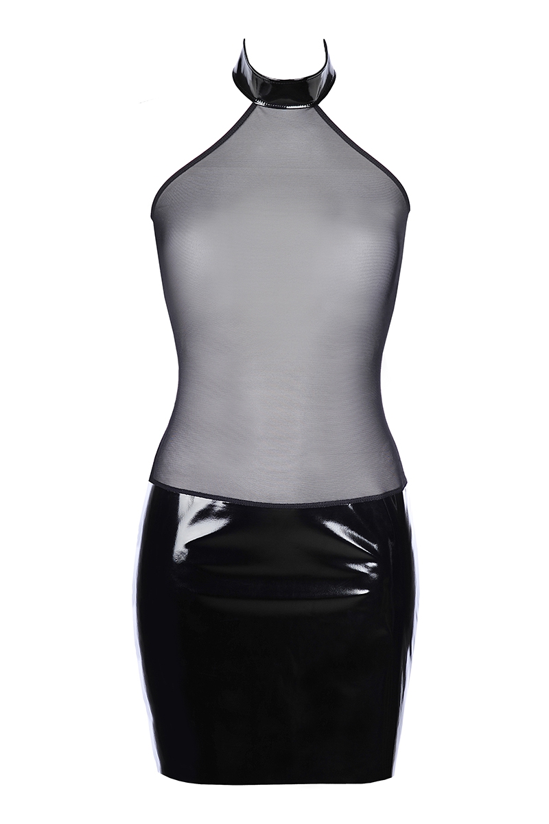 Robe courte noire en vinyle brillant et tulle.