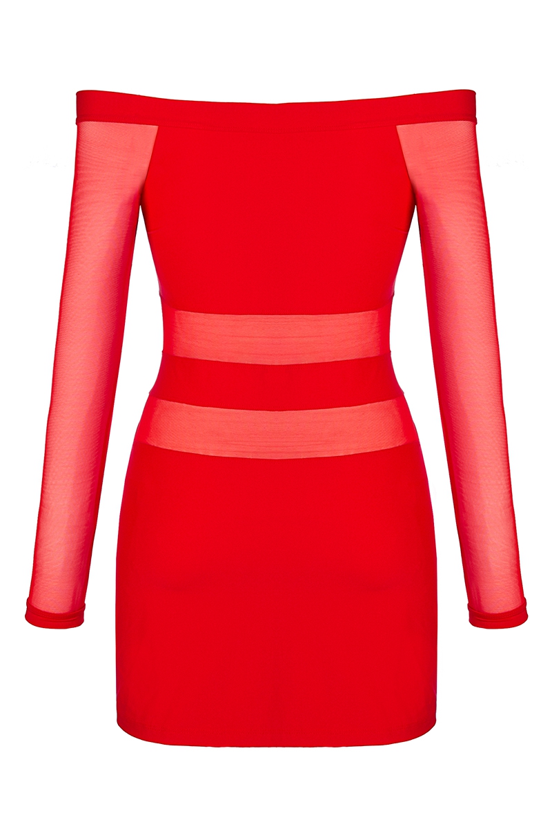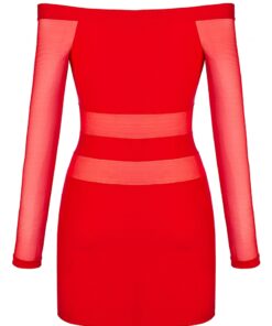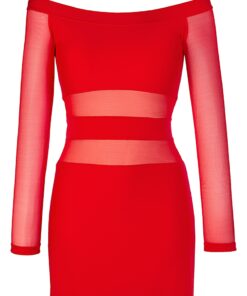 Robe courte rouge très sexy, ornée de 2 bandes horizontales transparentes en tulle qui laissent apparaitre le ventre et le creux des reins.