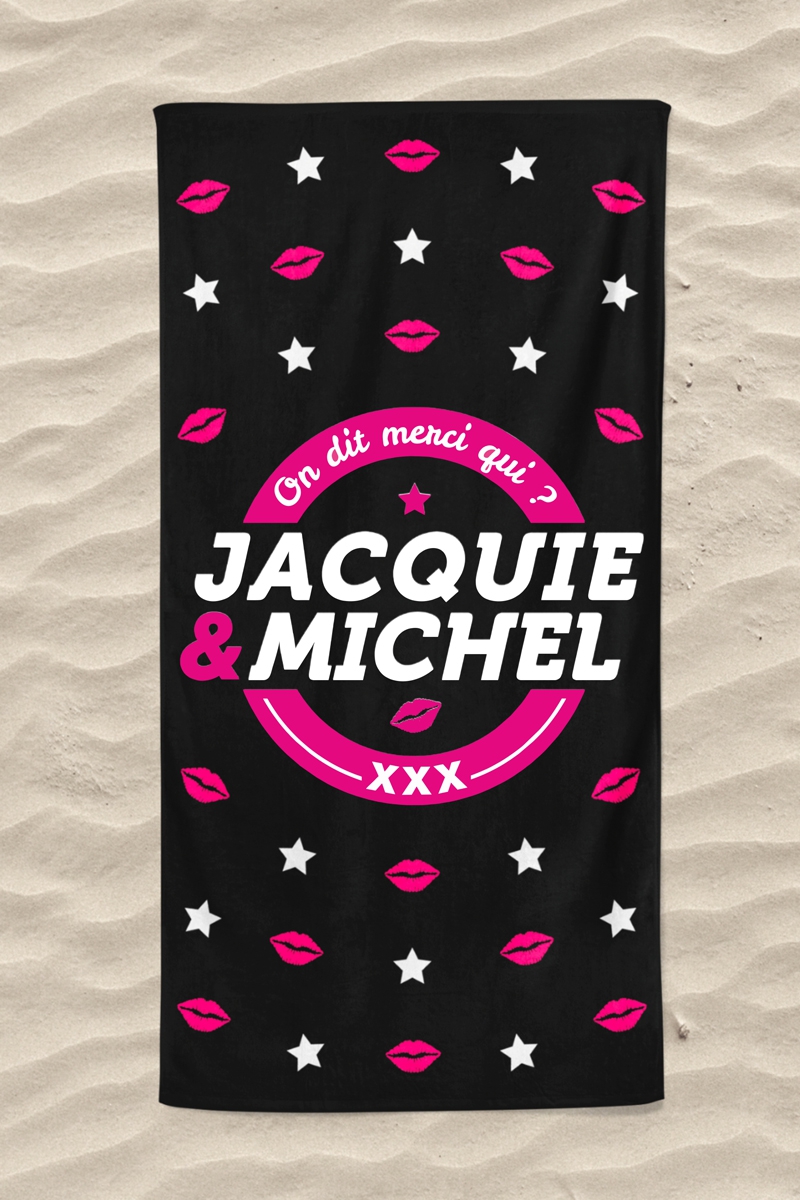 Serviette de plage J&M (150 x 75 cm), affichant le slogan préféré des français à l’aise dans leurs tongs : « On dit merci qui ? Merci Jacquie et Michel ». Le fond parsemé d’étoiles et de bisous apporte une touche originale ».