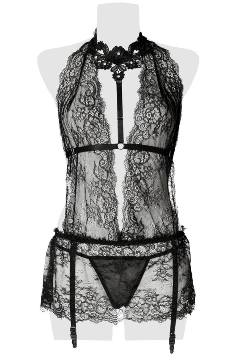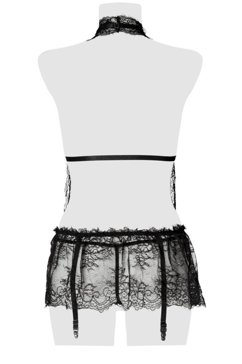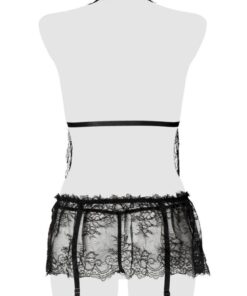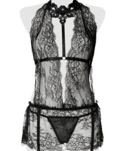 Ensemble érotique composé d’une robe courte en dentelle avec jarretelles, harnais de poitrine, et string assorti.