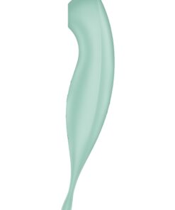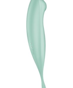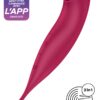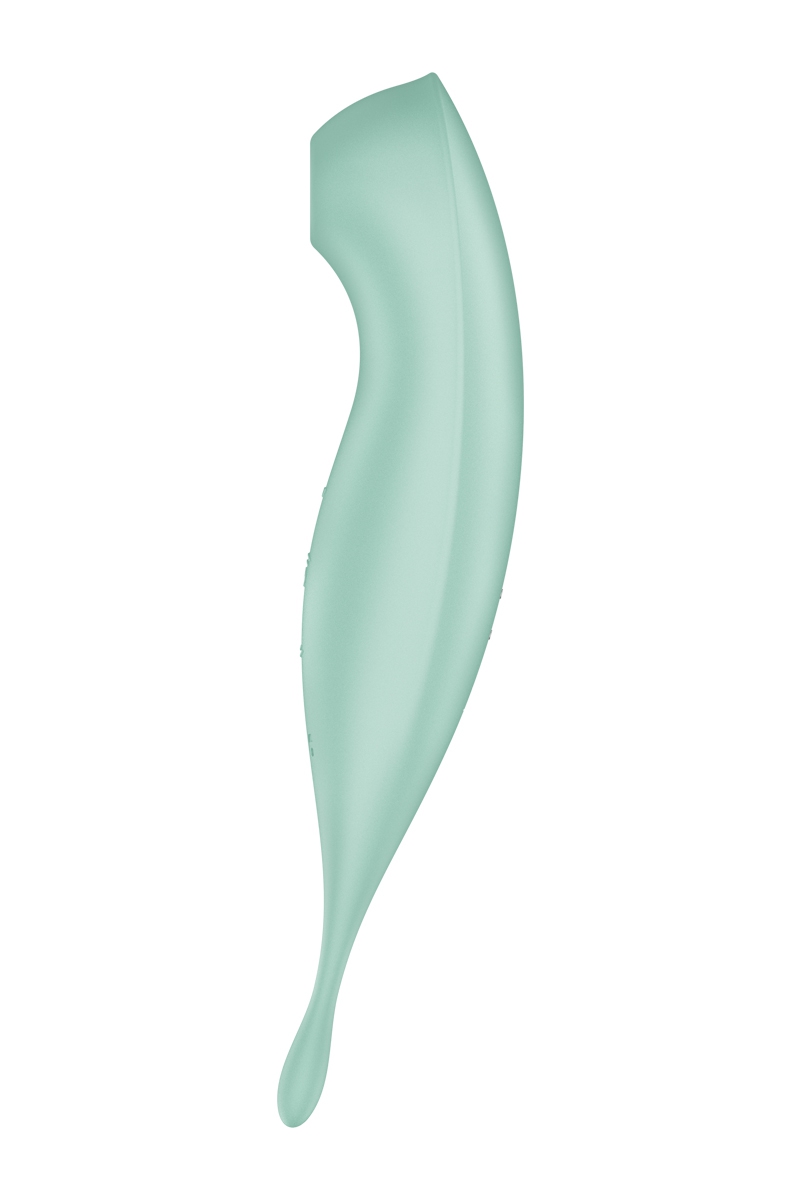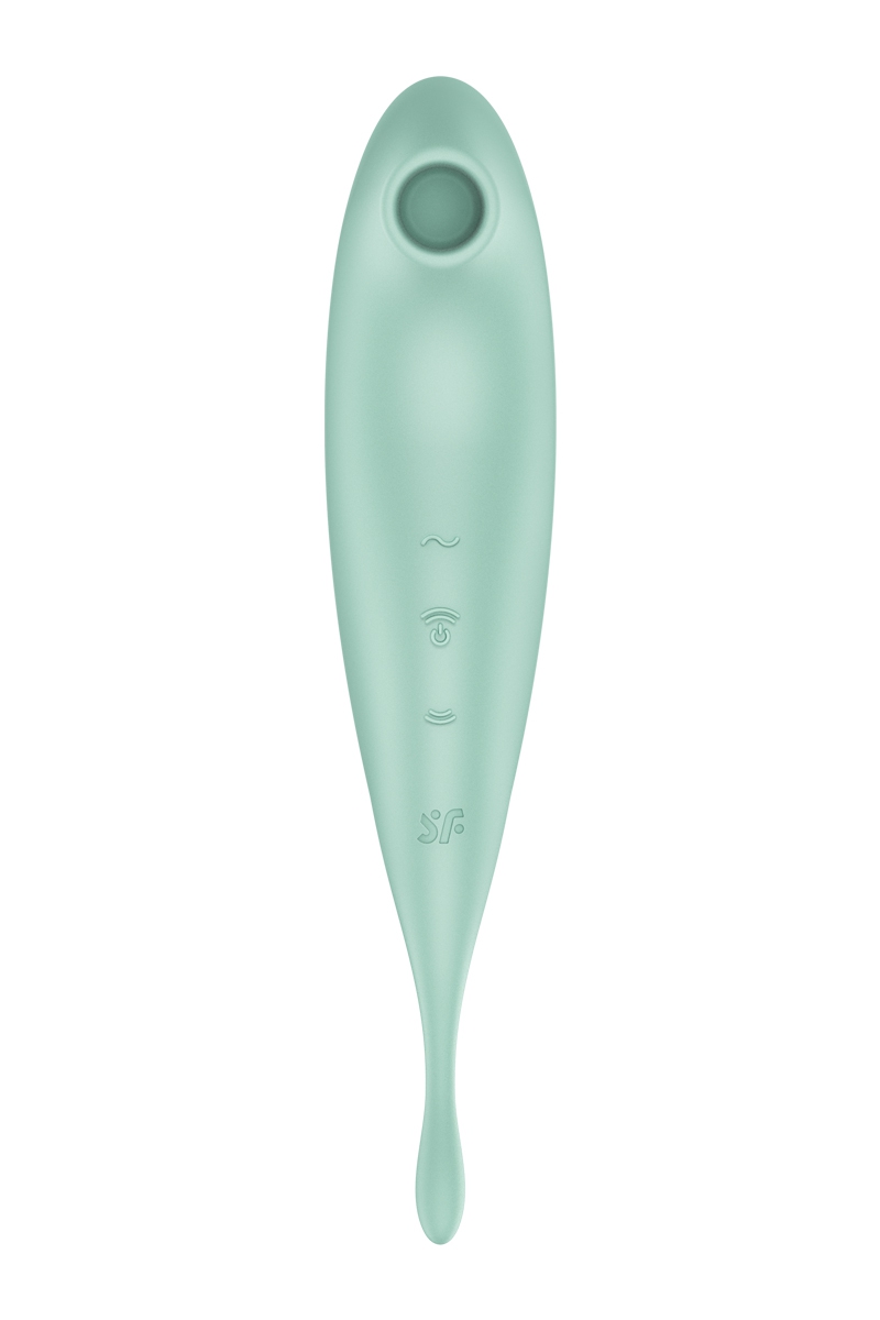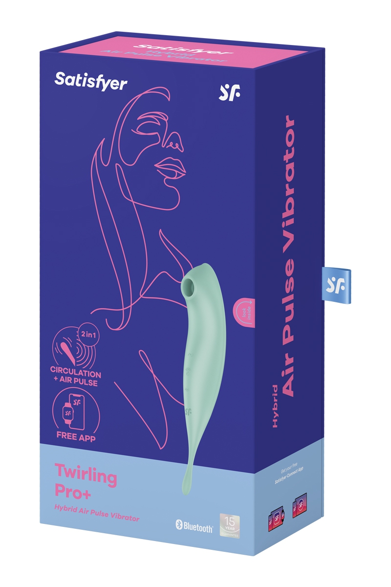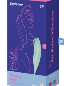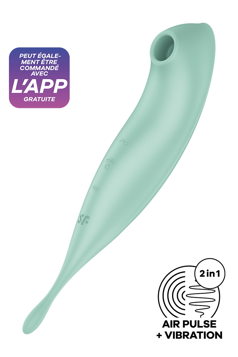 Le stimulateur deux en un Twirling Pro Connect App vert de la marque Satisfyer est un puissant stimulateur connecté destiné d’un côté à procurer une stimulation par vibrations précise et intense de toute zone érogène, tandis que l’autre extrémité stimule le clitoris par des ondes de pression.