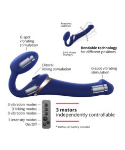 Le gode-ceinture Strap-On-Me « Multi Orgasm » est une évolution du modèle vibrant, doté en plus d’une langue vibrante permettant de simuler un cunnilingus.