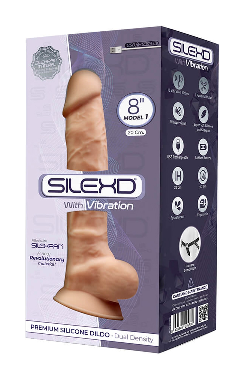 Vibromasseur rechargeable réaliste Premium en silicone double densité, dimensions 20 x 4,3 cm, 10 modes de vibrations.
